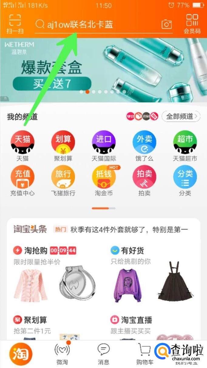 首先来看看怎么购物,下载好淘宝APP之后,登录已有账号,或者注册新的账号,然后进入淘宝首页,点击最上方的条框,输入自己想要的宝贝名称进行搜索。
