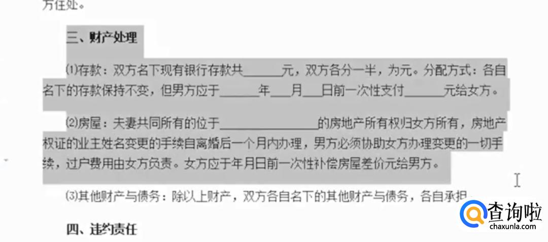 财产处理。一般情况下是双方的银行卡存款各是一半,其次是共同拥有的房产和其余财务的分配,都需要写清楚。