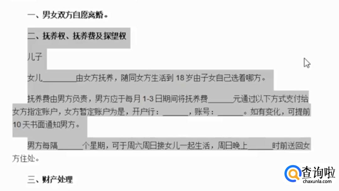 接下来是子女的抚养权、抚养费、探望权。写清楚子女抚养金额、抚养费账户和探望信息等等。
