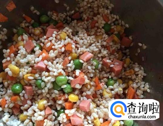 把青豆玉米胡萝卜火腿肠丁倒入泡好的糯米里,再加入少量盐,少量生抽,少量老抽,少量白糖,然后搅拌均匀备用