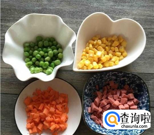 把备好的青豆和玉米粒洗干净,锅里加点水,烧开后,放进青豆和玉米焯两分钟水,再把胡萝卜和火腿肠切丁备用。