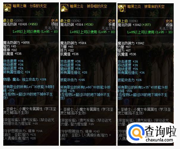 天空套是以减少技能CD为特色的一套装备,对于续航型职业来说一些表现出色且CD很短的技能在天空套的加成下可以有更好的发挥,并且天空套区别与其他两套装备在首饰上额外加成了许多三速,对于依靠攻速释速吃饭的职业十分友好。