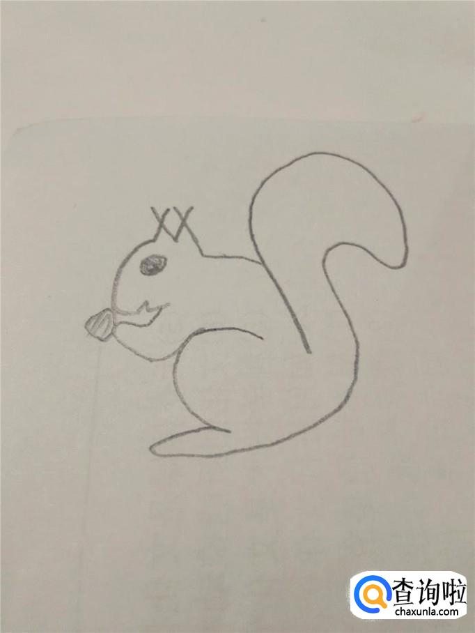 在小松鼠的前肢左边画一个小三角形,里面画几道短线,表示松果。