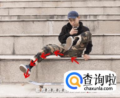 摆小腿:当你的前脚向上收起超过前桥钉组的时候,这个时候要向前方去推滑板的板头,记得是推板头而不是板肚子(杠杆原理),另外记得推的这个过程,从水平面看过去,你的小腿像是画了一个扇形。