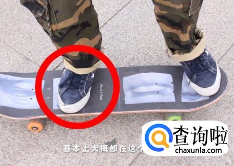 脚位:前脚放置于滑板正中与前桥钉组之间的区域,后脚放在板尾上与前脚成一个微外八的角度,后脚外侧边缘可以与滑板板尾齐平。
