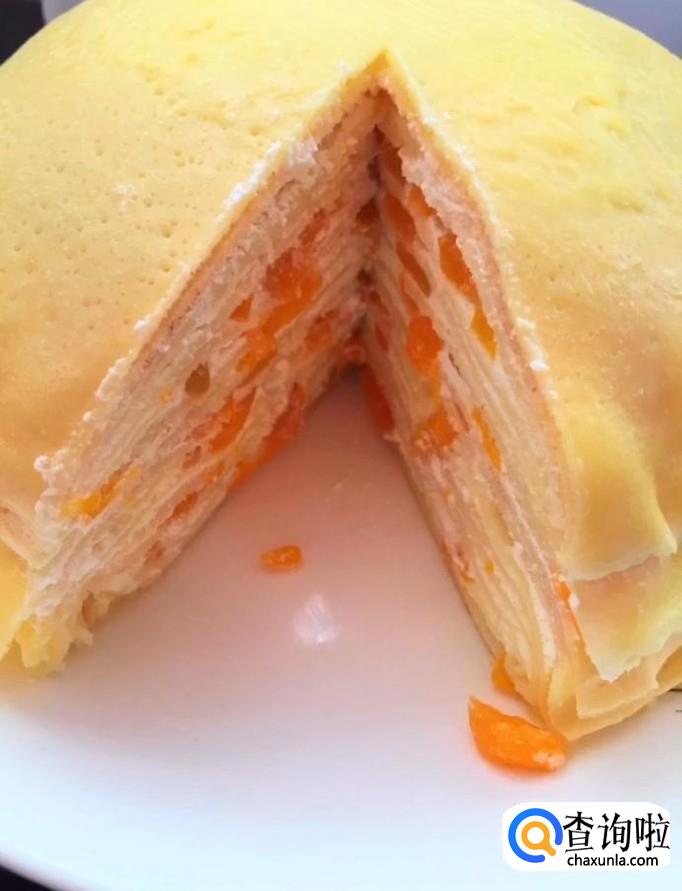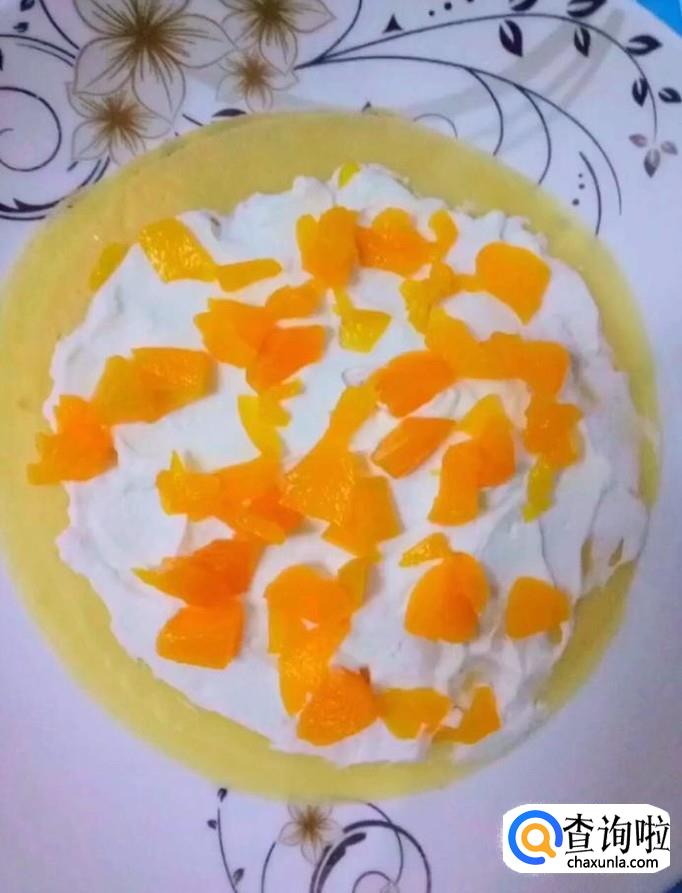 然后我们取出冷藏好的饼皮,在底部放两张,抹上一层奶油,撒上一些芒果碎,如此反复的这样做,依次叠加