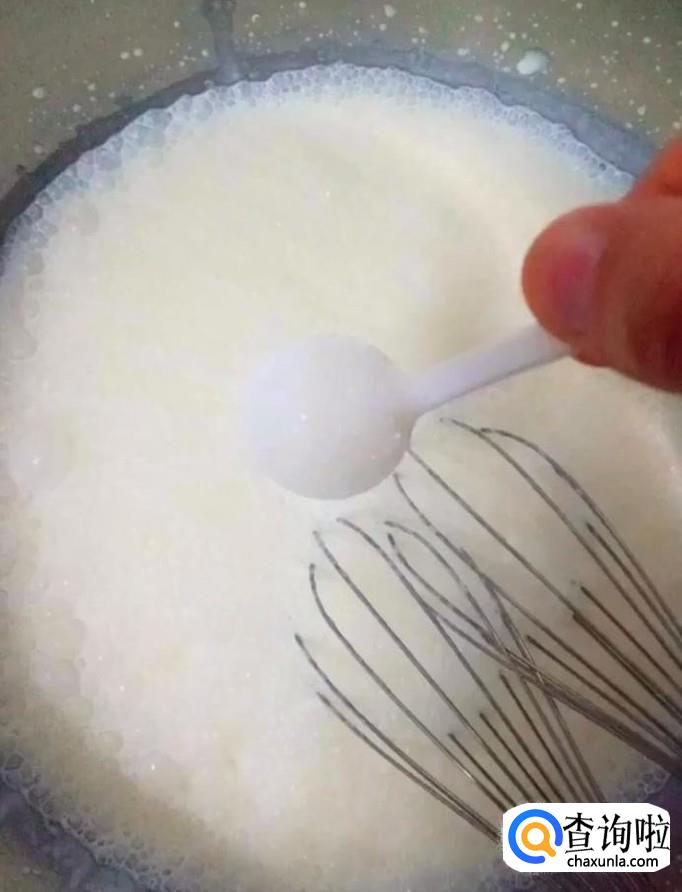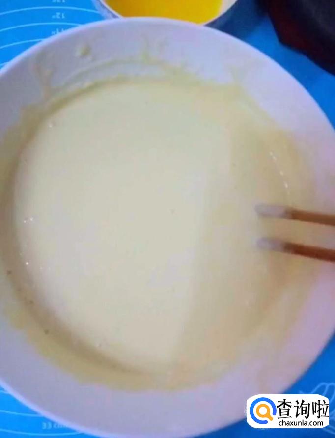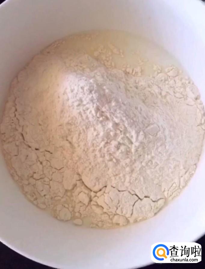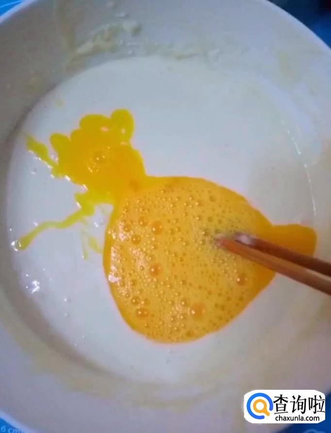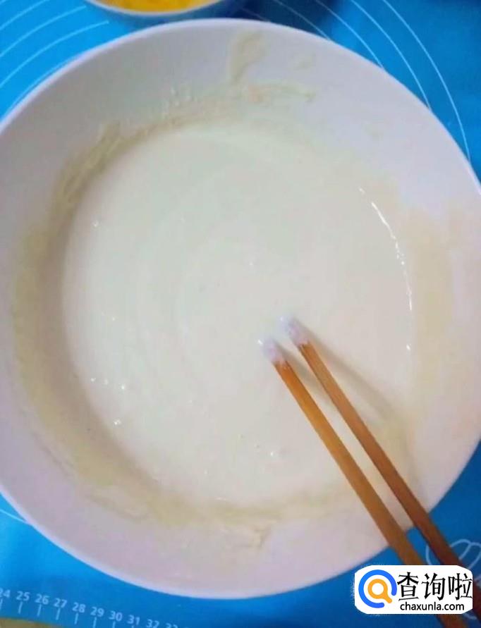 然后我们再另一个碗中加入适量的面粉,适量的纯奶,搅拌均匀,调成酸奶浓稠度的面糊