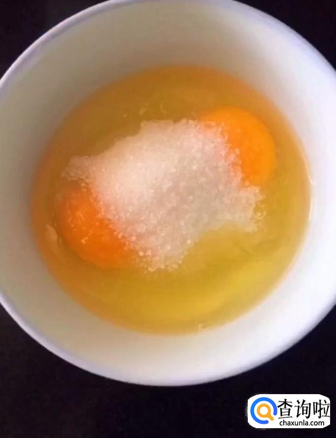 首先,我们把3个鸡蛋打入碗中,加入35g的白糖,搅拌均匀备用