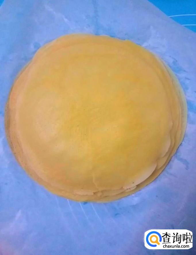 我们按照这种方法依次煎熟多个薄饼,放在吸油纸上面,放入冰箱冷藏20分钟左右