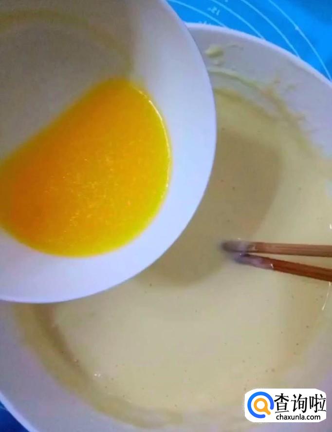 接着我们将鸡蛋液倒入面糊中,搅拌均匀,再倒入融化好的黄油,再次搅拌均匀