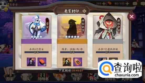 阴阳师悬赏封印任务中,玩家可能会随机刷到神秘妖怪榜单,玩家只能根据系统提供的线索和事件描述来判断要击杀的怪物,其中雨女的线索就是泪珠、雨、伞。