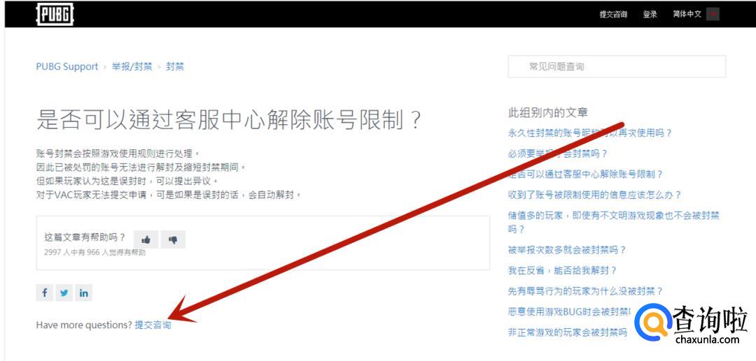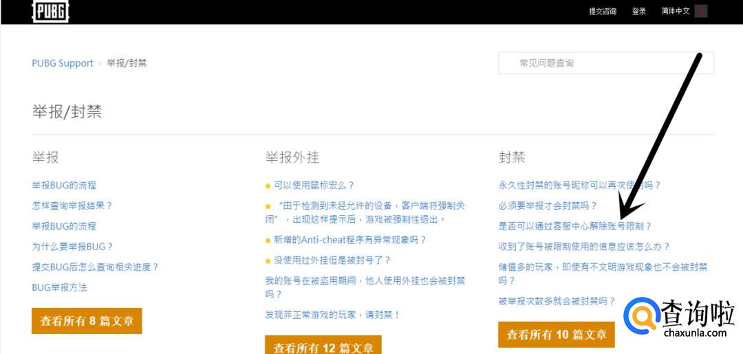 进入相关页面后,我们可以看到有关人举报和举报外挂以及封禁的一些文章,我们看到封禁那一栏,其中第3行是否可以通过客服中心解决账号限制,我们点击这个文章。