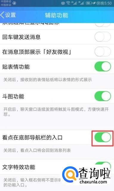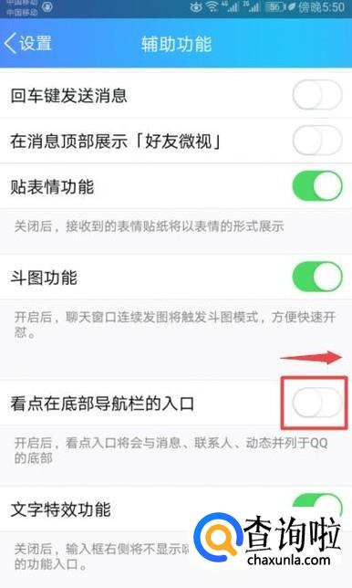 然后我们将看点在底部导航栏的入口的开关向右滑动;