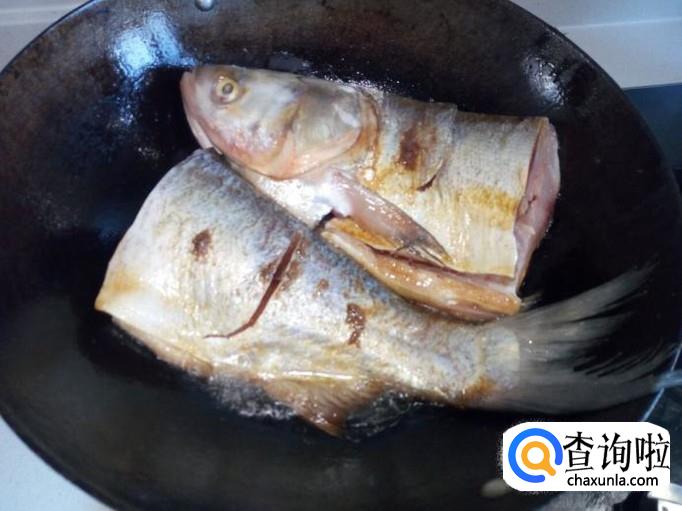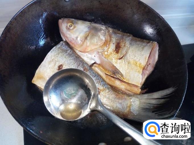 鱼个大不好翻面,用勺适当的把锅里的热油,往鱼身上浇一下。