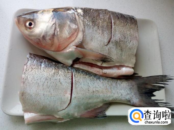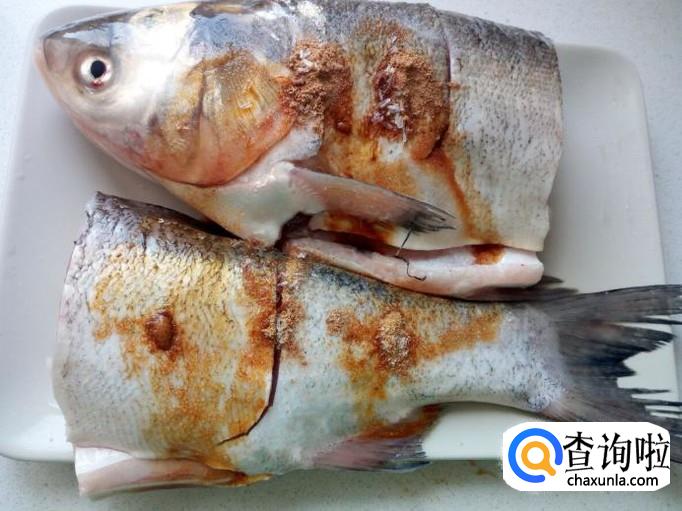 把鱼收拾清洗干净,控干水分。然后用刀把鱼一分两半(鱼太大,小一些的鱼不用切开)。