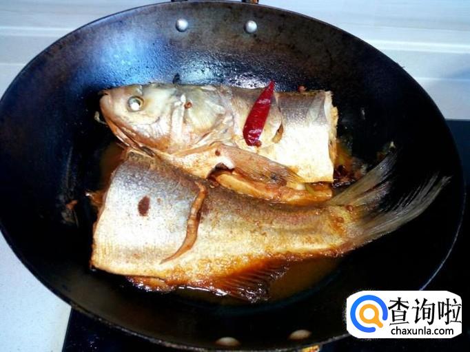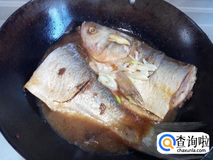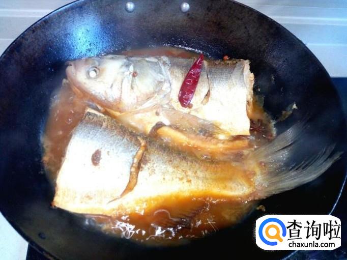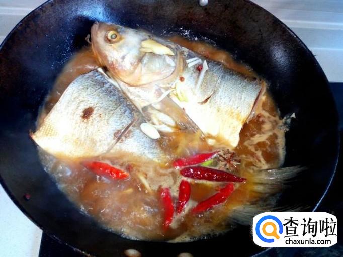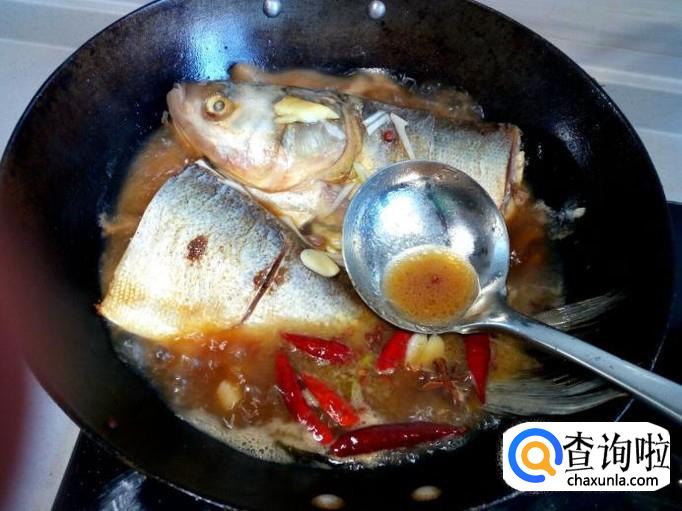 料汁略烧一会,随即放入适量的水(水不要太多),大火烧开,转小火慢炖。炖的时候,适当用勺把汤汁往鱼身上浇一下,便于入味。
