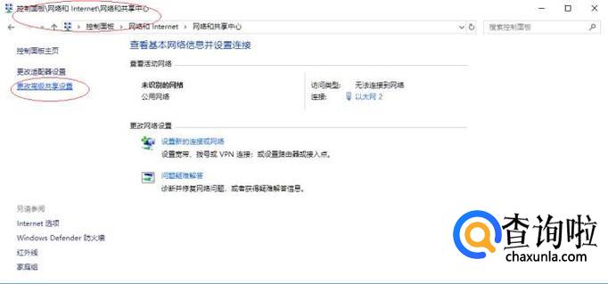 唤出"网络和共享中心"选项界面,如图所示。点击左侧"更改高级共享设置"图标,下步将进行共享文件的首选项设置。