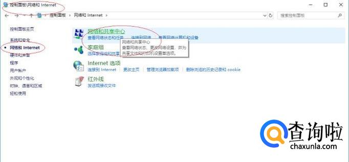 如图所示,唤出"网络和Internet"选项界面。点击右侧"网络和共享中心"图标,用于查看网络状态、更改网络设置。