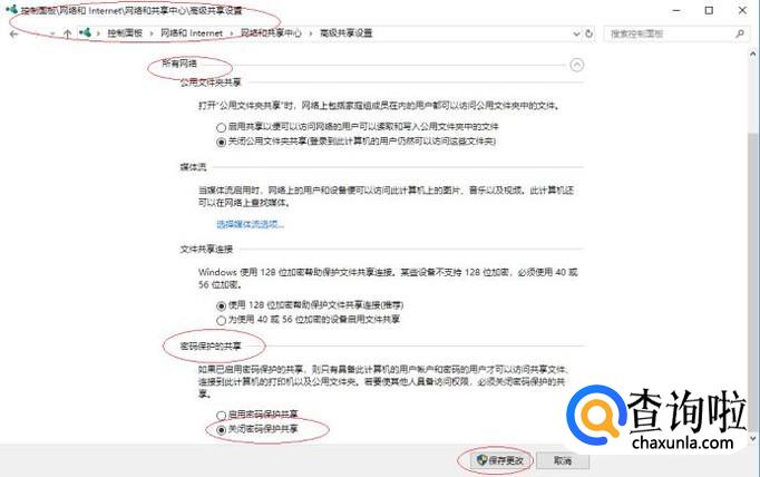 勾选"密码保护的共享→关闭密码保护共享"单选框,如图所示。本例到此结束,希望对大家能有所帮助。