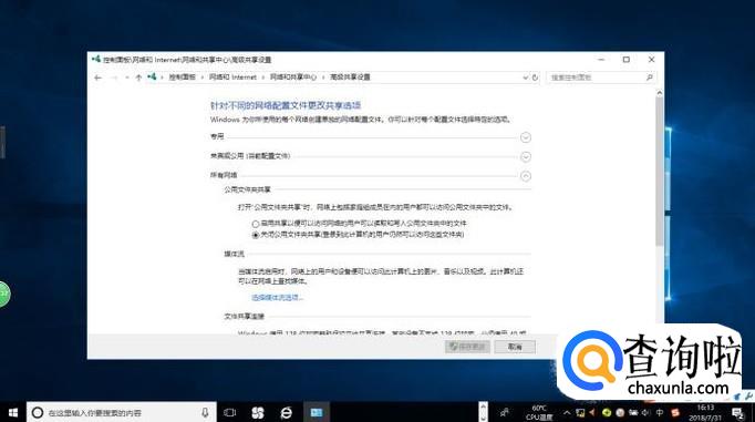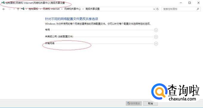 如图所示,唤出"高级共享设置"选项界面。用于针对不同的网络配置文件更改共享选项,点击"所有网络"右侧向下箭头。