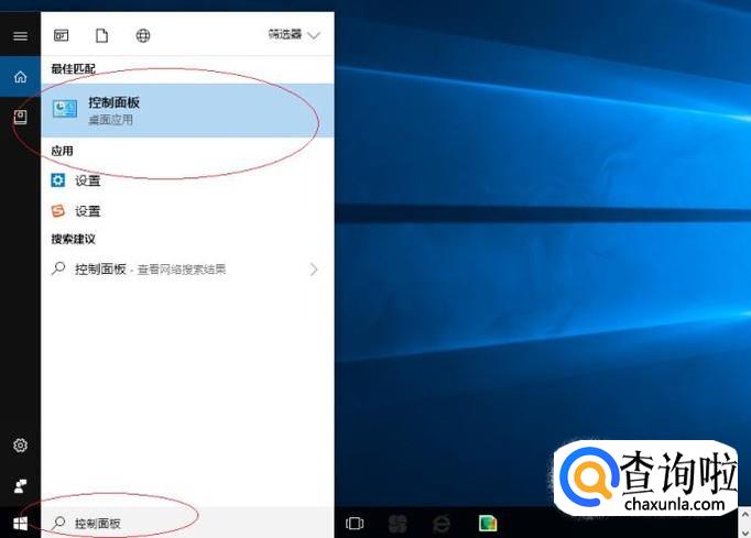 如图所示,搜索框输入"控制面板"。Cortana(小娜)显示搜索结果,点击"最佳匹配→控制面板"项。