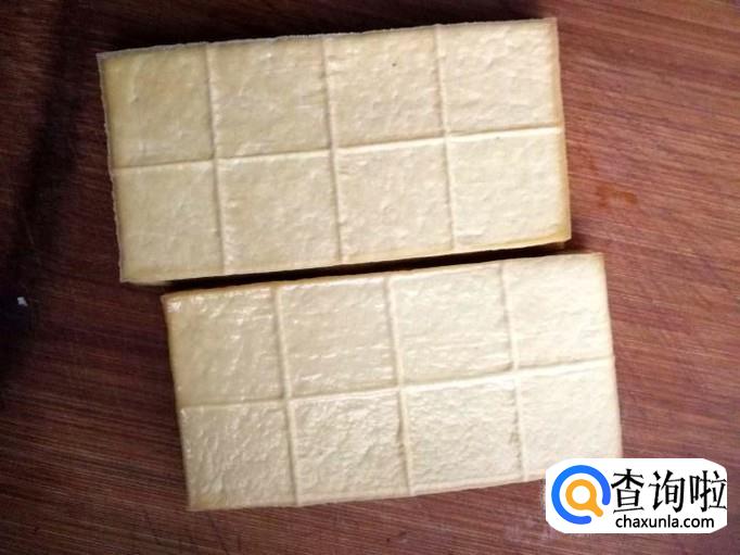 豆腐干温水洗净表面后,切成小丁。