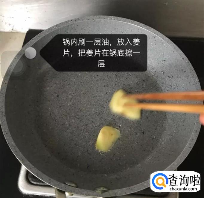 然后锅内刷上一层油,放入姜片,把姜片在锅底擦一层,如下图所示。
