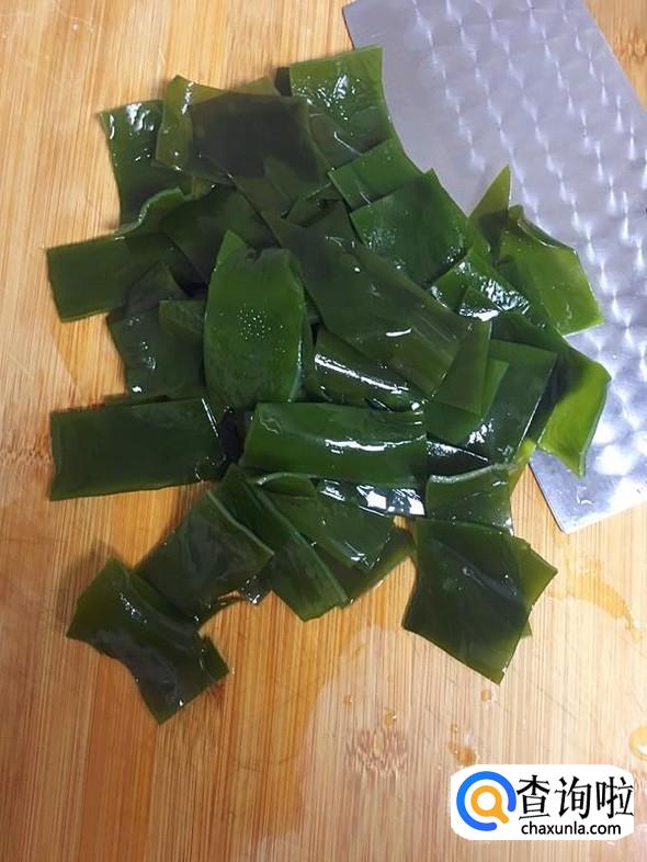 干海带用水浸泡,期间要多换几次水,泡软后清洗干净,切成小块。