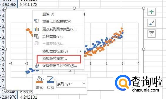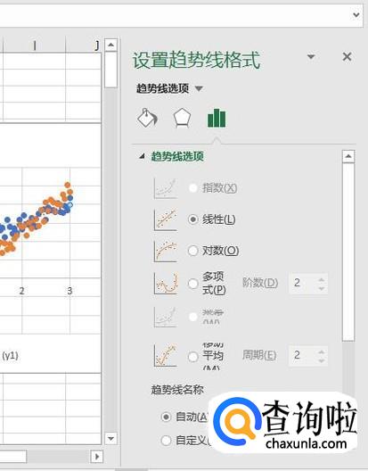 在y1的点上单击右键,选择"添加趋势线",然后弹出趋势线的选择窗口。