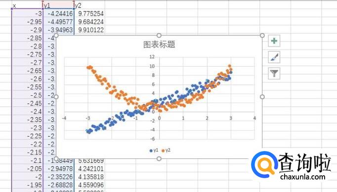 这样就在同一幅图上生成了两个散点图,如图所示。可以看出,x与y1近似线性,我们就可以添加线性趋势线。x与y2近似二次我们可以添加二次趋势线。