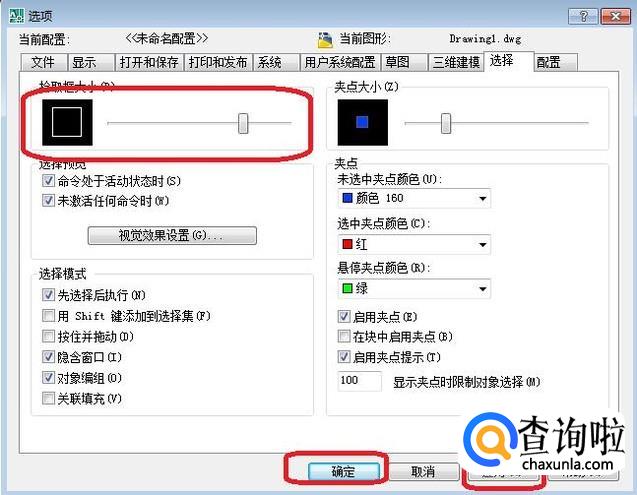 如图所示,在该标签下往右移动滑块就可以调大拾取框了,设置完成之后点击“应用”“确定”即可。