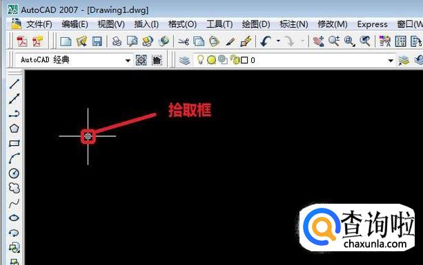 首先,我们打开一个CAD的新建文档来演示,如图所示,我们看到默认的拾取框很小。