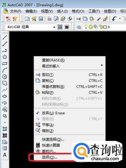 我们在CAD屏幕上右键单击,调出菜单,然后点击选择“选项”。