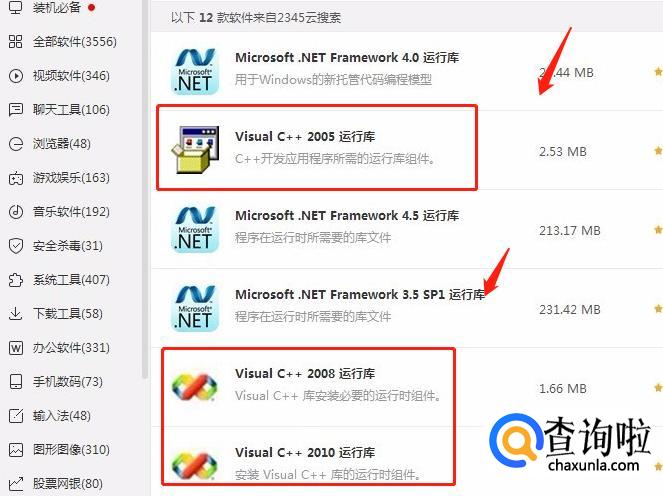 这时可尝试通过软件管家搜索“运行库”,逐一安装“visual C++2005、2008和2010”运行库文件。