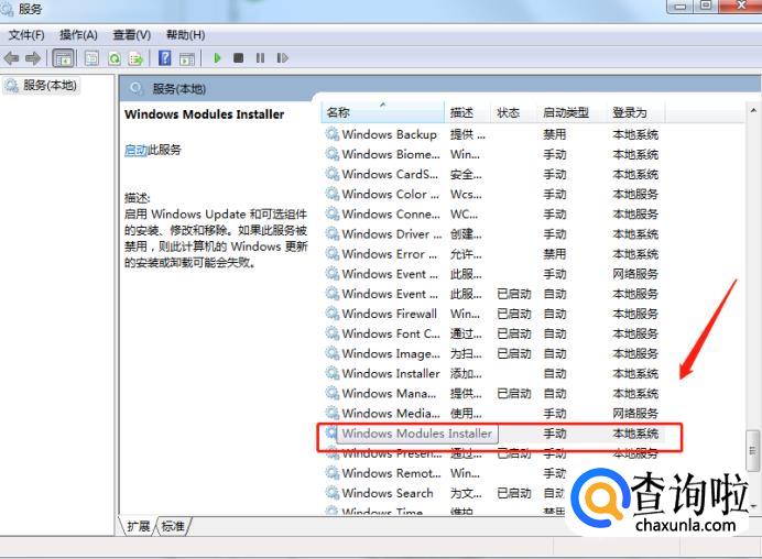 在打开的如图本地服务窗口中,下拉找到“Windows Modules Installer”服务,窗口中的名称是按照字母顺序A-Z排列的,默认启动类型为“手动”。这个服务跟windows的更新和可选组件的安装、修改删除有关,本例中为非windows系统组件跟这一服务无关。但建议设置为“手动”,不要禁用。