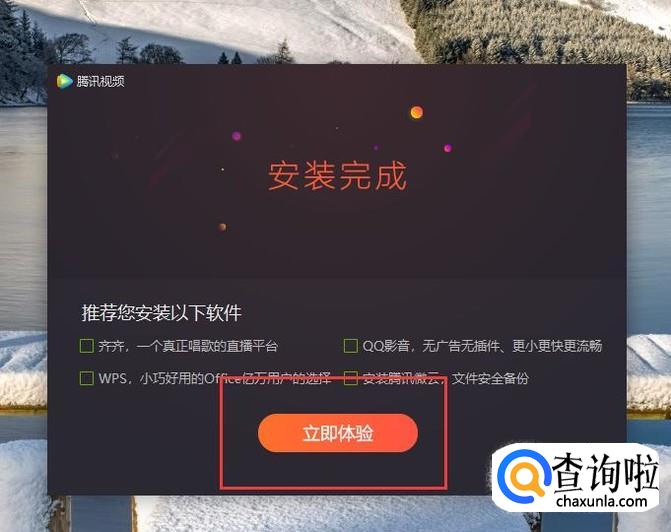 等到安装程序进行到最后一步时,点击取消安装界面中的推荐安装软件勾选,并点击“立即体验”按钮即可打开腾讯视频客户端软件主界面。