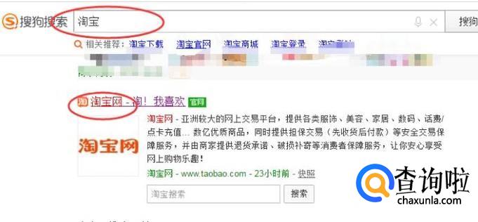 在浏览器搜索【淘宝】,点击具有官网标志的链接,如下图所示: