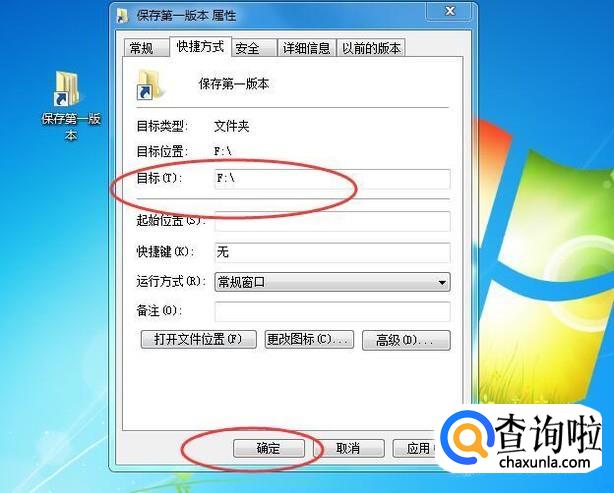 在快捷键方式下方的【目标】更改名称为F:/,然后点击确定按钮,如下图所示: