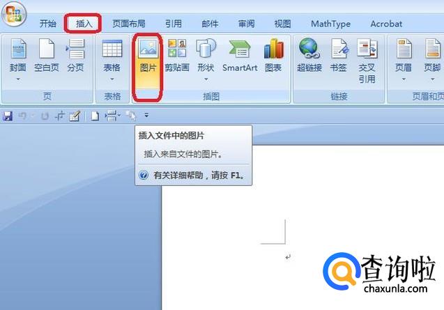 首先,我们打开一个空白的Word文档用来演示,点击“插入”,工具栏中点击“图片”按钮。