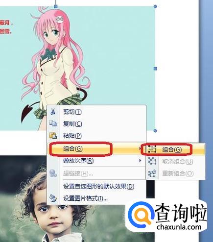 按住“ctrl键”,然后点击两张图片同时选中,单击右键,弹出菜单中选择“组合”。