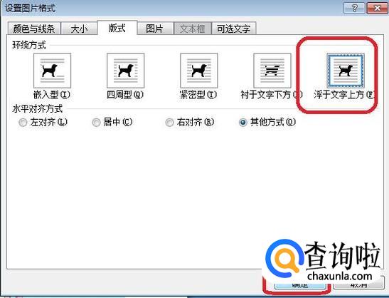 因为Word默认图片是以嵌入式插入的,我们需要修改一下,右键分别单击图片,选择“设置图片格式”,在“版式”标签下,把环绕方式改成“浮于文字上方”。