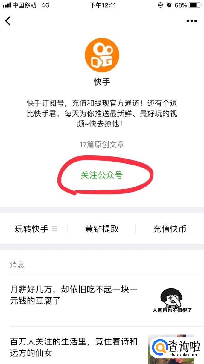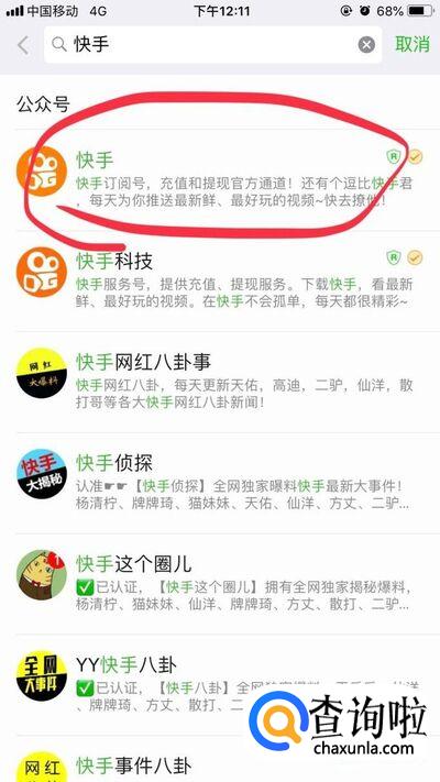 搜素之后,会看到快手公众号,点击第一个公众号,并关注