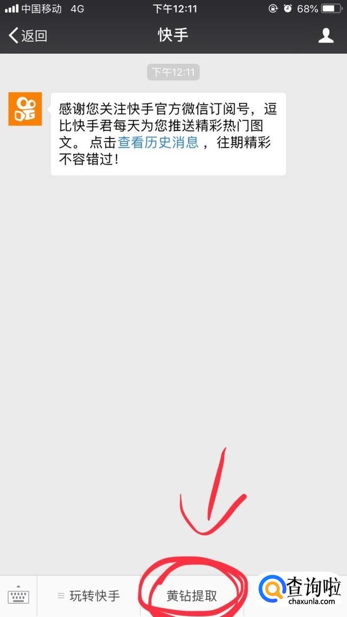 关注之后会自动跳出来公众号的页面,点击下方“黄钻提现”,会跳出来“账号验证”,根据提示输入快手ID以及手机号,会得到相应的验证码,输入验证码点击确认即可提现