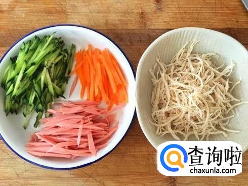 切一些黄瓜丝,胡萝卜丝,火腿丝,肉丝,或者是根据自己的喜好配上其他的菜,咸鸭蛋黄,肉松等等都可以的。