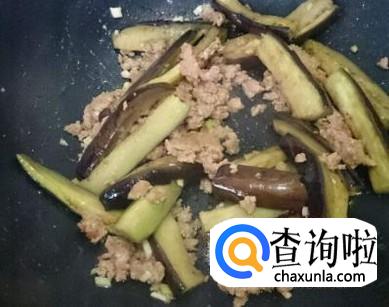 将线茄子放入锅中,再加入适量的酱油和盐,如果茄子较干,可以加少许清水,待茄子和肉末炒熟、入味,就可以出锅了。