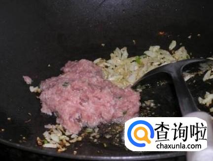 将肉馅放入锅中,用锅铲快速翻炒,炒至肉馅成白色。