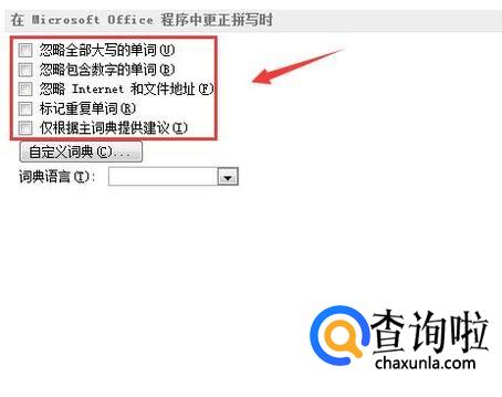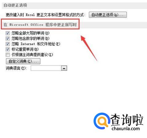 点击校对选项在右侧找到在Microsoft office程序中更正拼写时选项,如图所示: