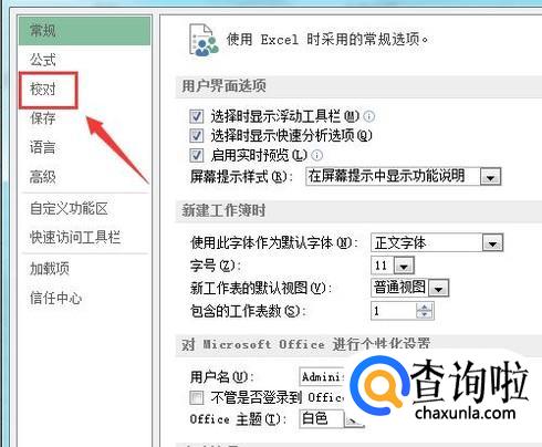点击选项在弹出的对话框内找到左侧的校对选项 ,如图所示: