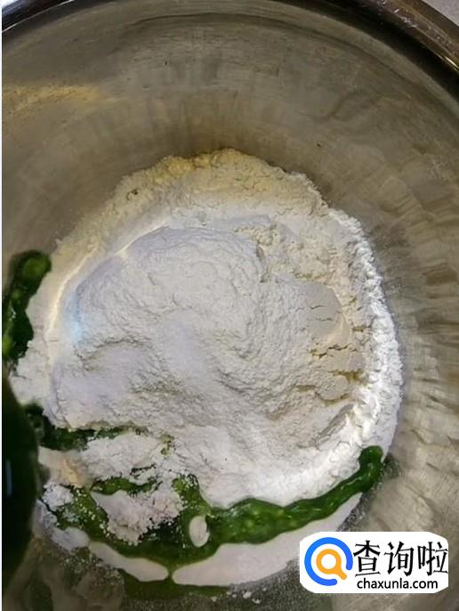 首先准备适量的面粉,然后倒入榨好的菠菜汁并揉成面团。