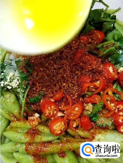 再撒上一把辣椒面。倒入一勺热油。